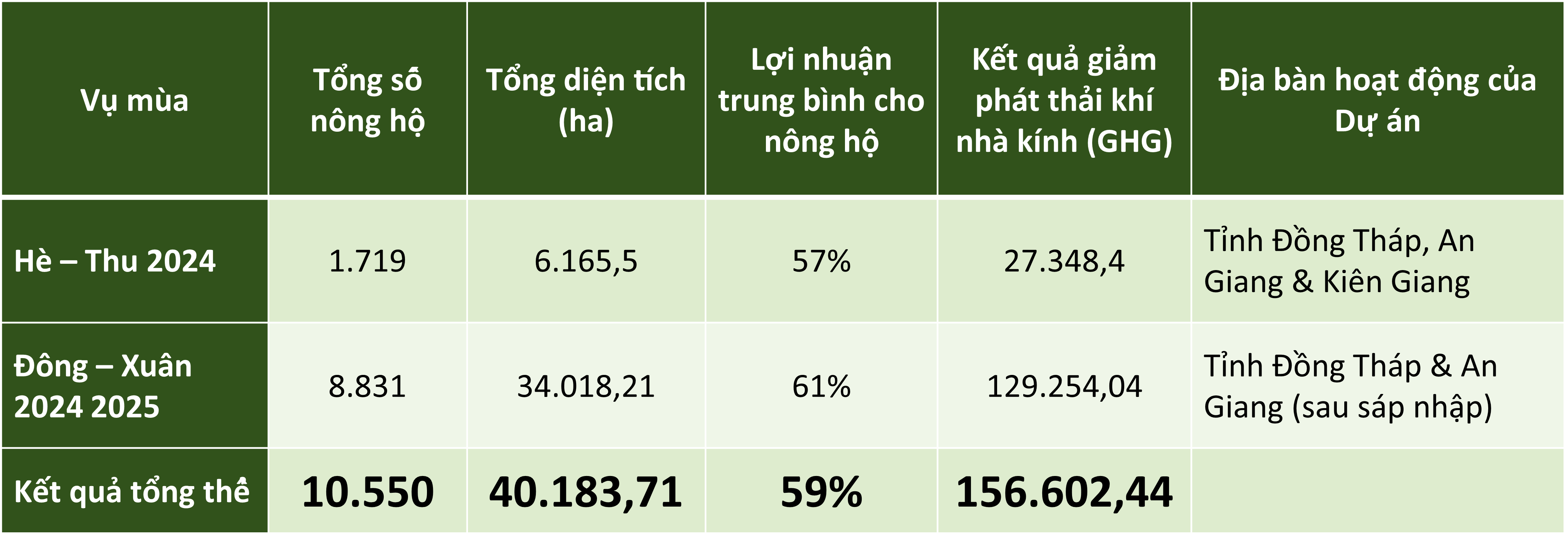Bảng 1: Kết quả thực hiện Dự án TRVC sau 2 vụ Hè-Thu 2024 (Vụ 1) và Vụ Đông-Xuân 2024-2025 (Vụ 2) đóng góp thực hiện Đề án 1 triệu Ha