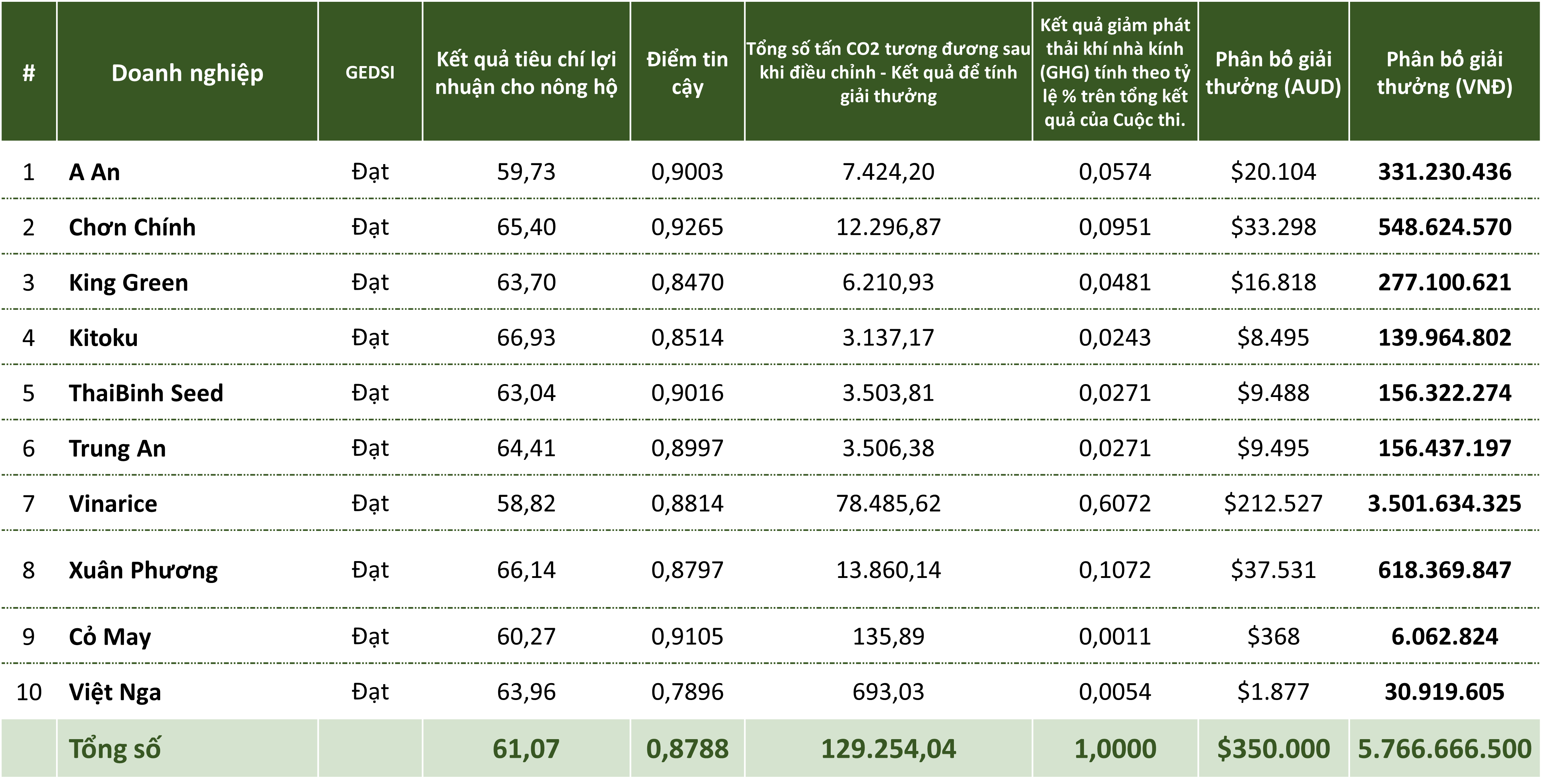 Dưới đây là bảng tổng kết kết quả của 10 Doanh nghiệp tham gia Dự án TRVC – Vụ Đông - Xuân 2024 - 2025. Trong tháng 08 năm 2025, SNV đã chuyển khoản số tiền Giải thưởng cho 10 Công ty được giải theo danh sách dưới đây.